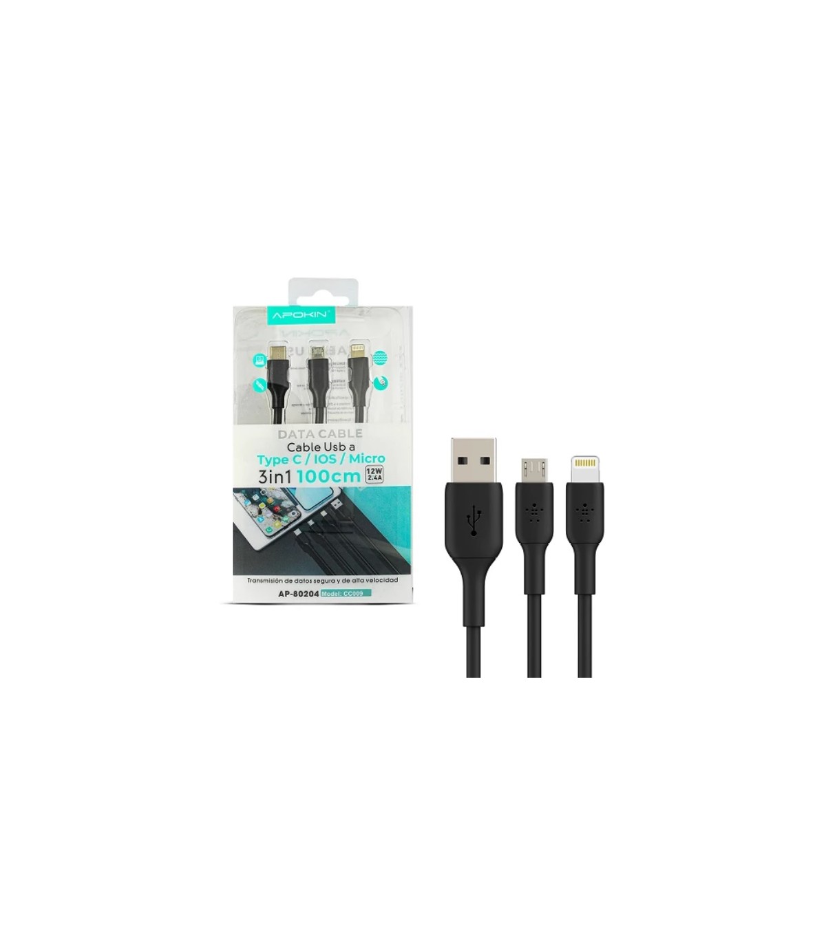 Cable APOKIN 3 en 1 tres conectores para todos los modelos de movil TipoC, MicroUSB Y Tipo-C A USB A, carga y sincroniza tu dispositivo con cualquiera de los 3 conectores, puedes utilizarlo con un cargador de coche, casa o cualquier fuente de alimentación con salida USB para cargar tu dispositivo.