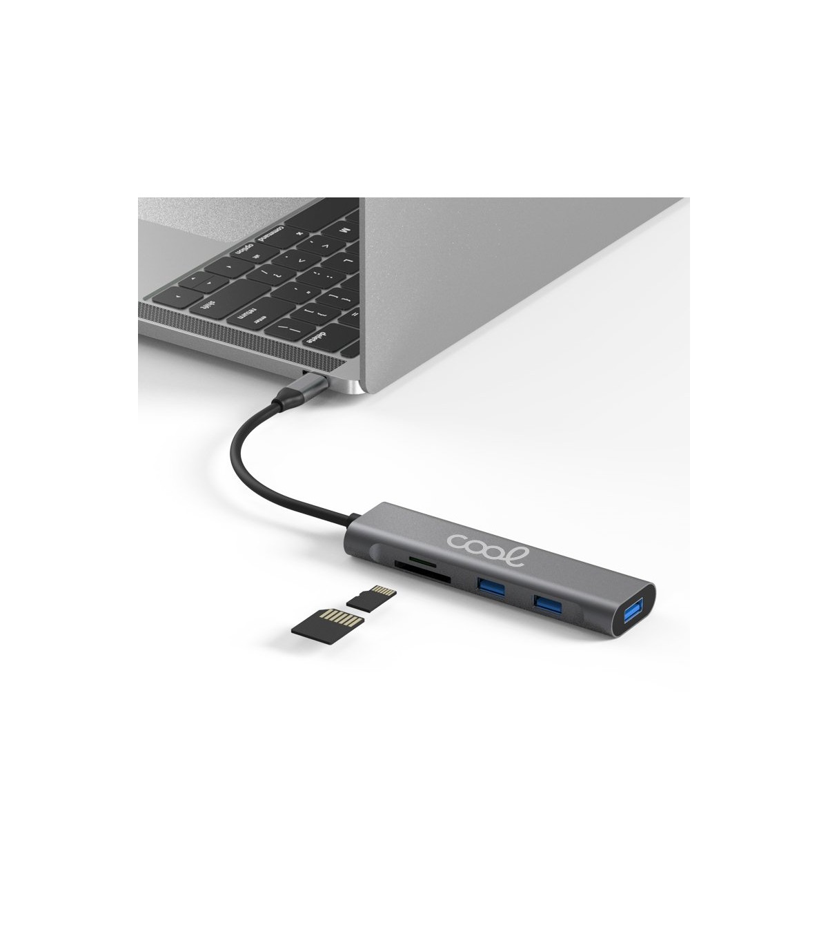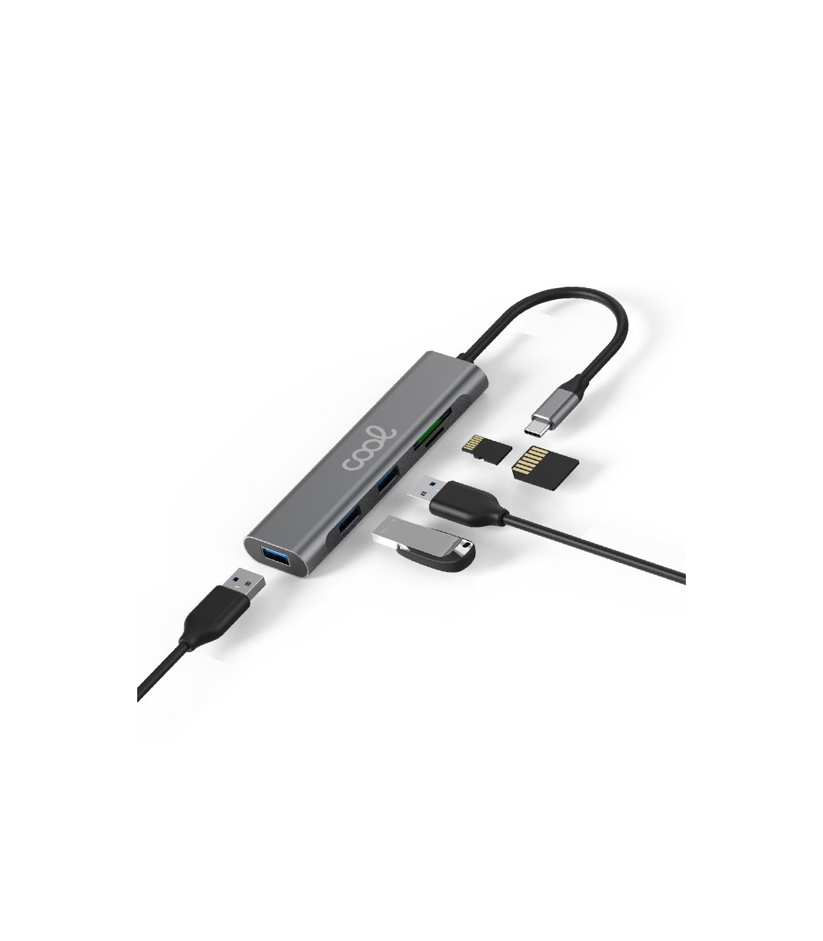 Fabricado en material ABS. 3 entradas USB 3.0, 1 entrada Micro SD y 1 entrada para tarjeta SD.